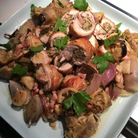 ROAST, STUFFED CHICKEN ROLLS WITH ARTICHOKES, SAGE AND SPECK