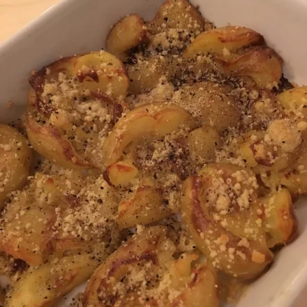 Oil one or two ovenproof baking dishes and place the cooked potatoes in one scant layer in each. With the back of a spoon or with gloved hands, squash the potatoes so that the skin is broken and the flesh is revealed. Drizzle with the remaining olive oil and season with salt and pepper. Bake until golden brown but not quite ready. Remove from oven while you cook the chicken. While the chicken is resting, sprinkle the potatoes with the parmesan and return to the oven to heat through and become crispy and a rich golden brown.